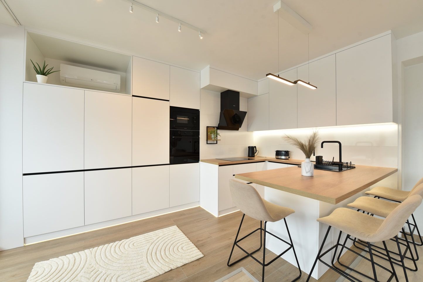 Obzirom da je stan novije gradnje, vanjska stolarija je PVC, dok je unutrašnjost uređena drvenim elementima. Podovi su obloženi parketom i keramičkim pločicama, a ulazna vrata su blindirana.