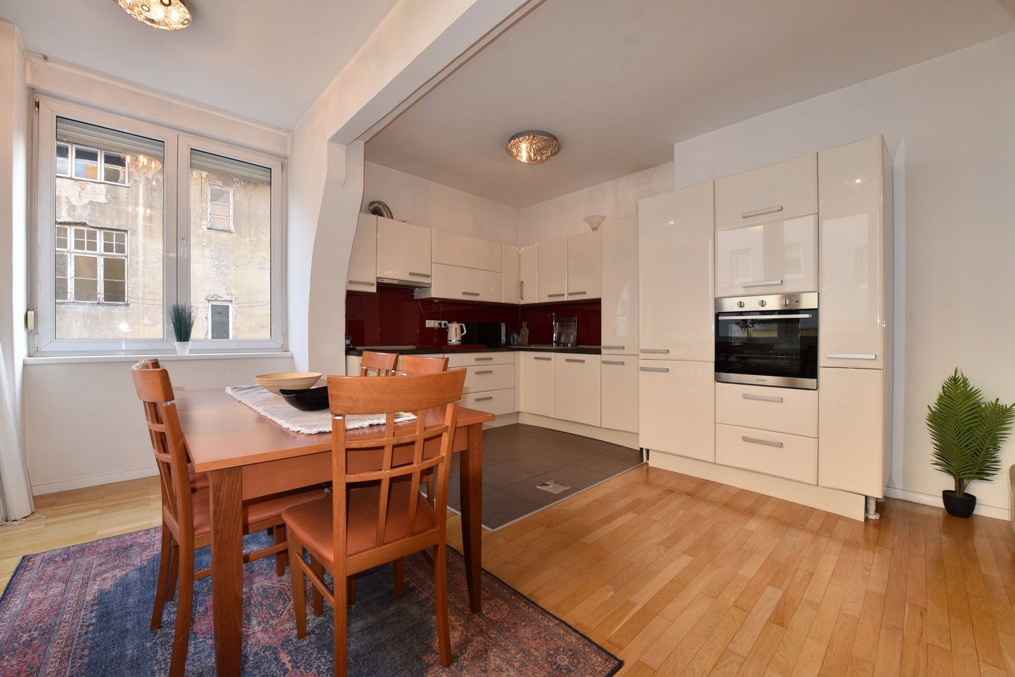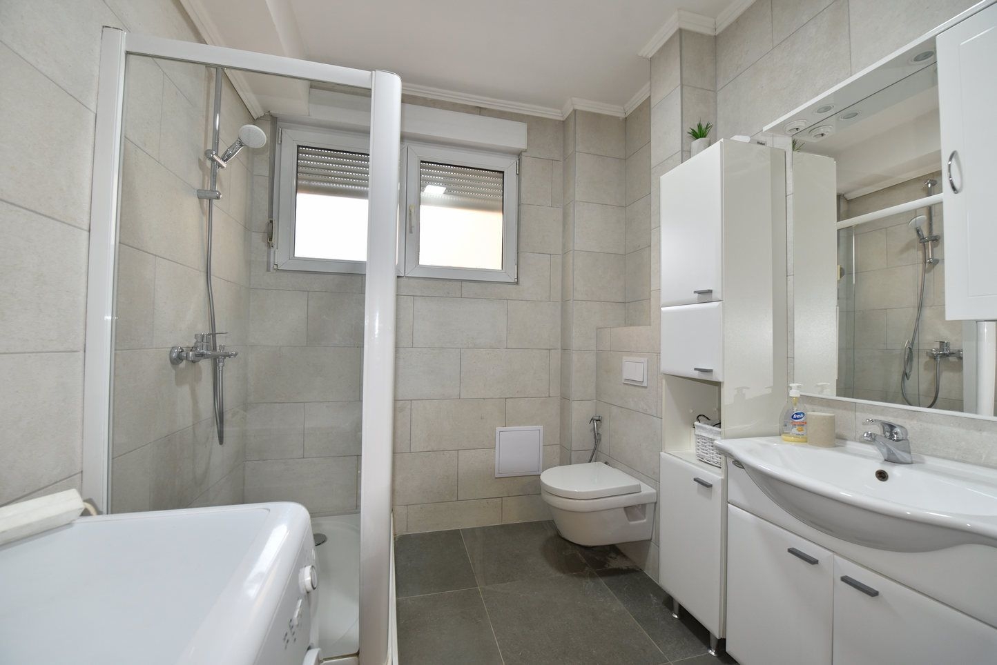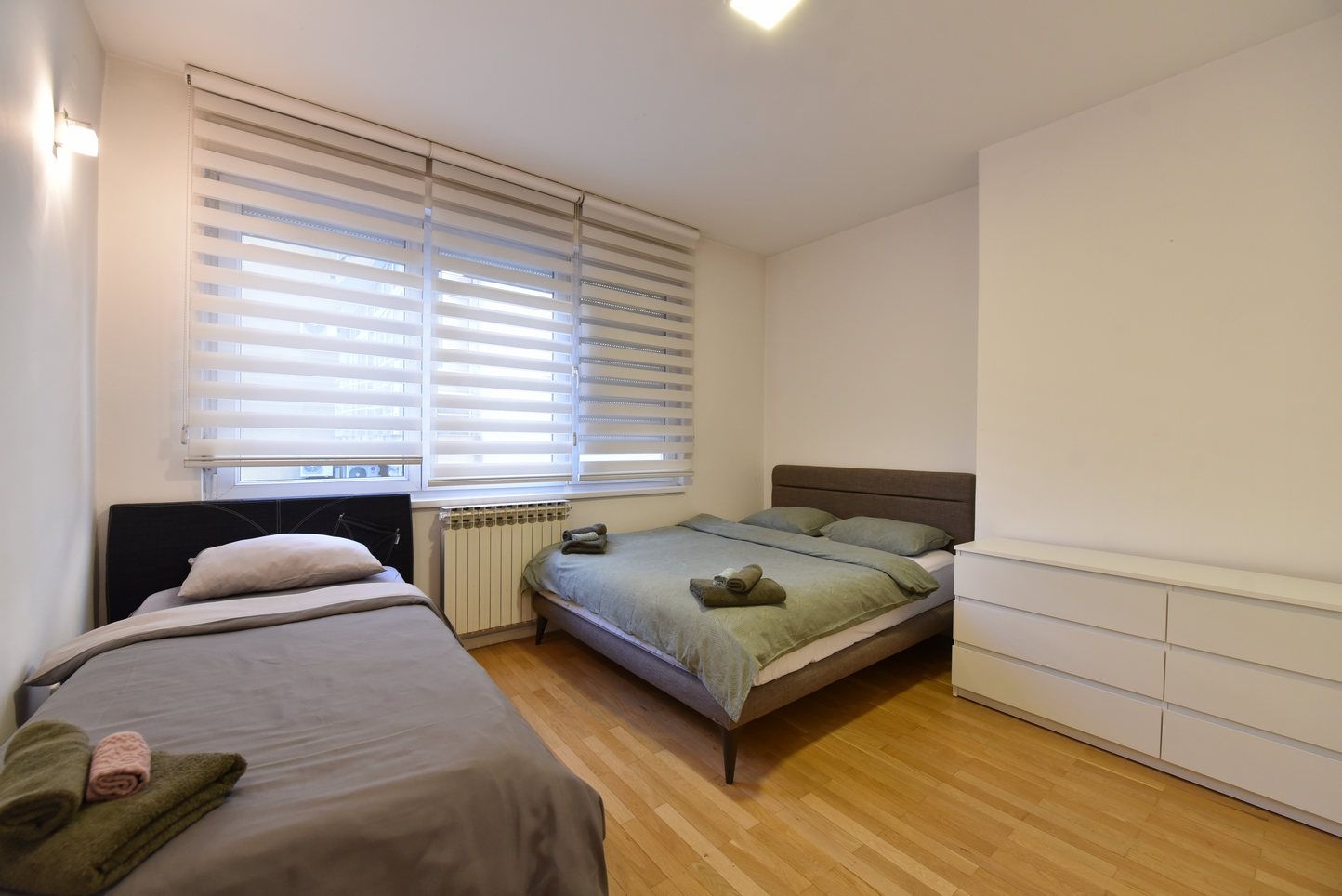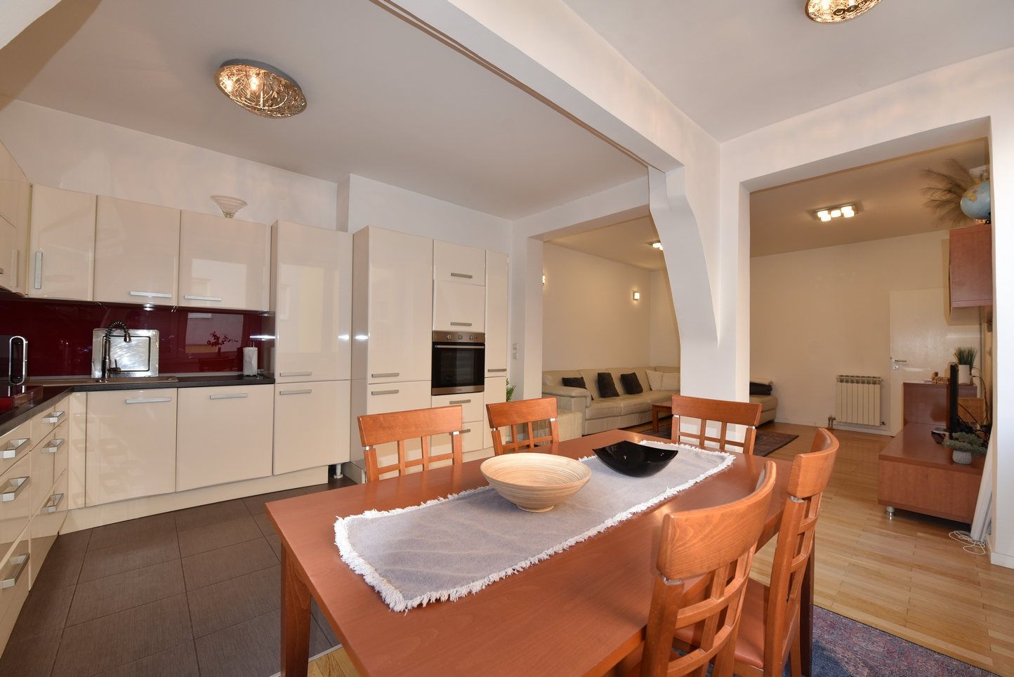 Sastoji se od: prosrtanog dnevnog boravka sa kuhinjom i trpezarijom, dvije spavaće, kupatila i ulaznog hodnika. Stan je kompletno opremljen i namješten.