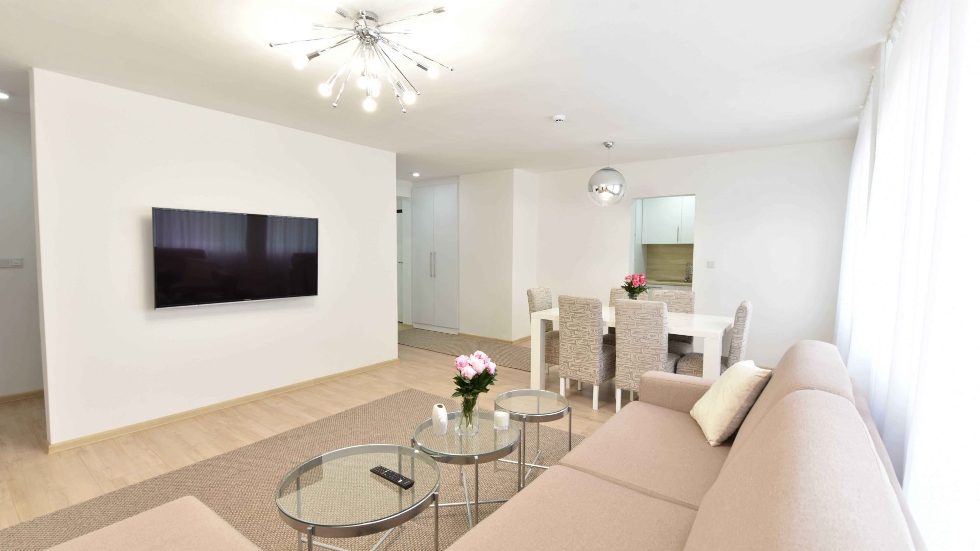 Sastoji se od prostranog dnevnog boravka sa trpezarijom, odvojenom kuhinjom, dvije spavaće sobe, dva kupatila i ulaznog hodnika.