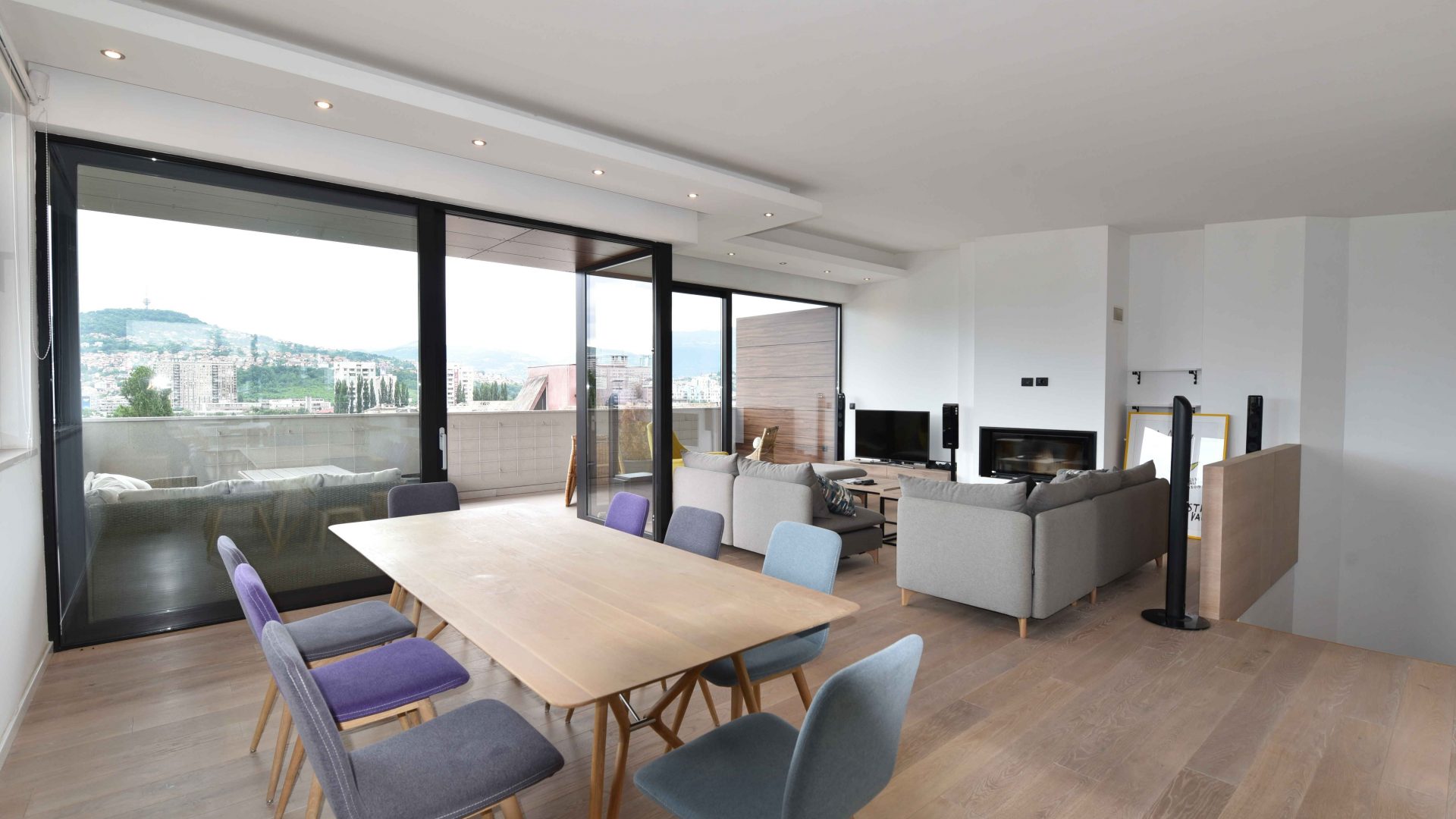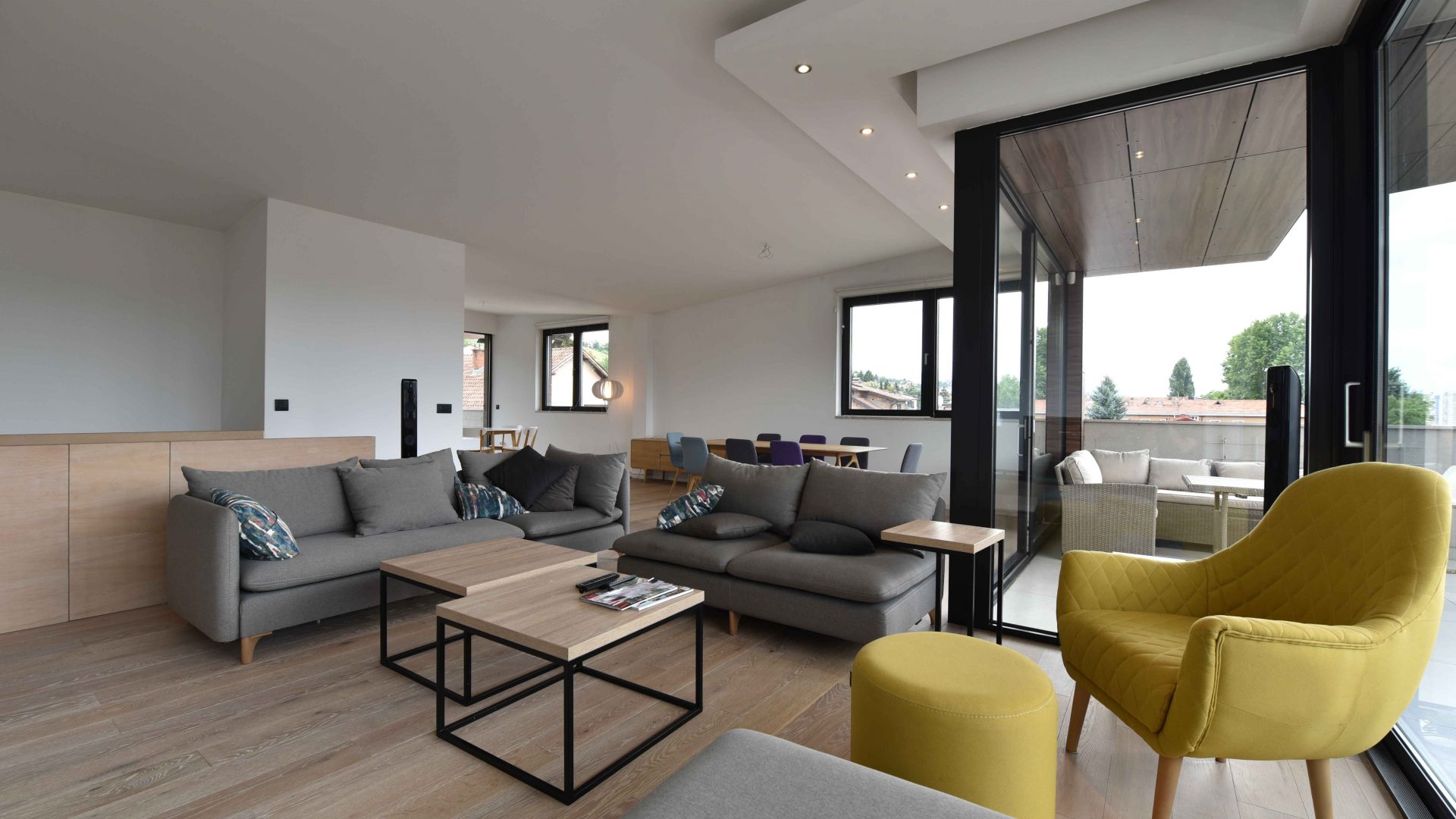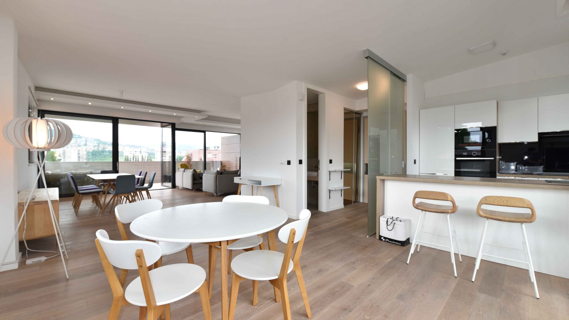 Iznajmljuje se luksuzan i moderan dvoetažni stan u privatnoj zgradi na Grbavici ukupne površine 210 m2. Stan se sastoji od prostranog dnevnog boravka sa kuhinjom i trpezarijom koji ima izlaz na dvije terase, 3 spavaće sobe, 3 kupatila, garderobera, saune i još jedne terase na donjoj etaži.