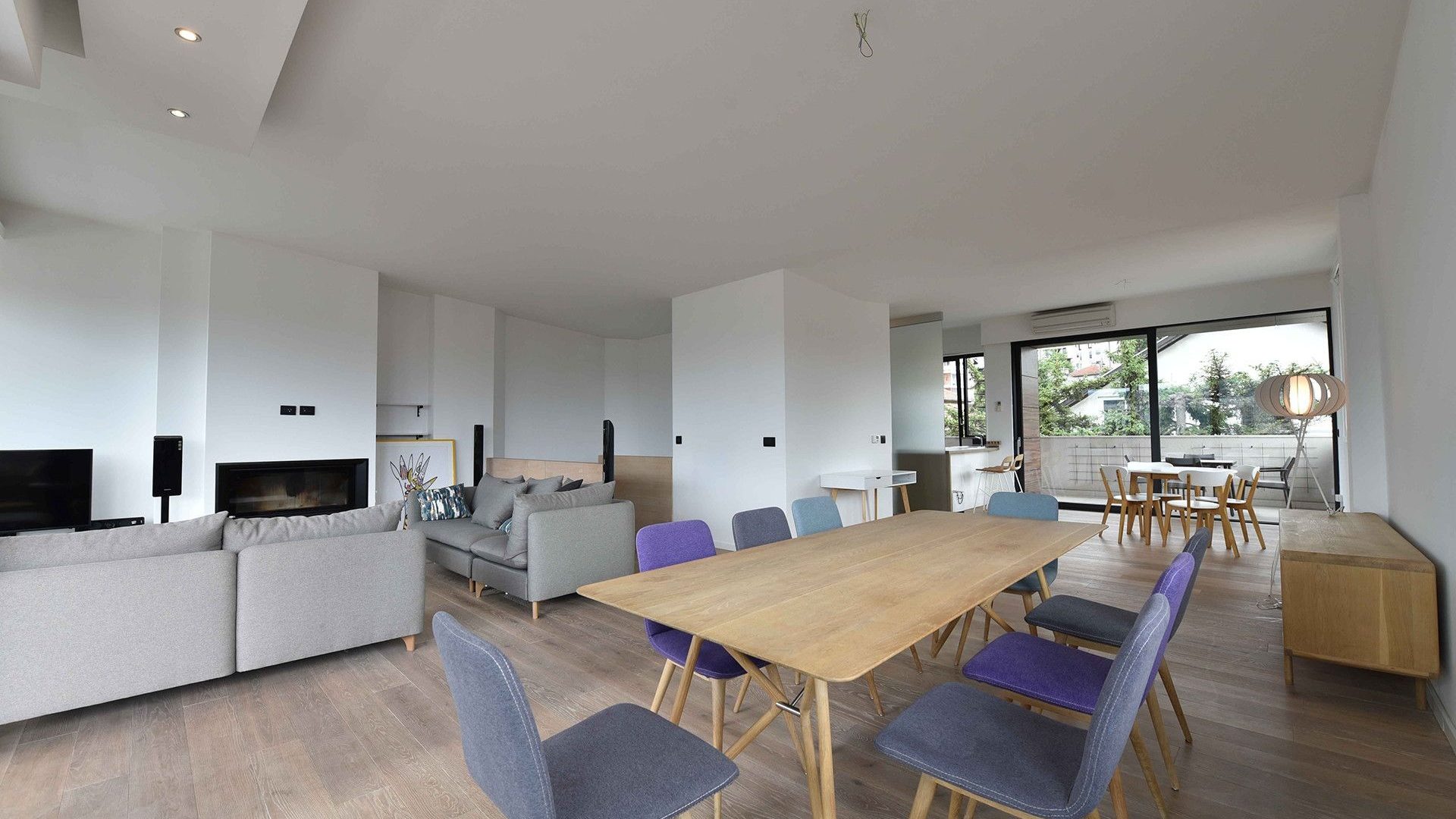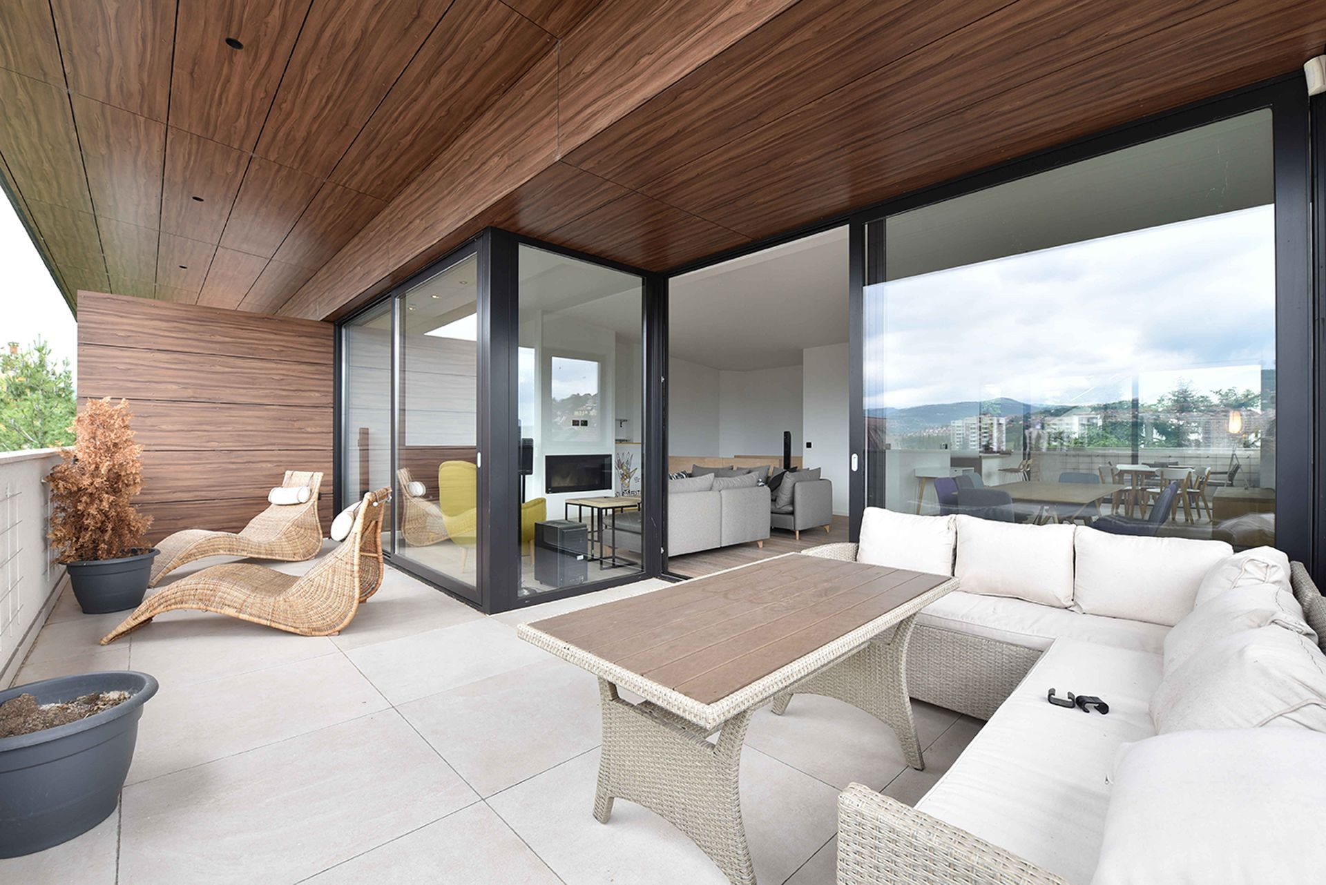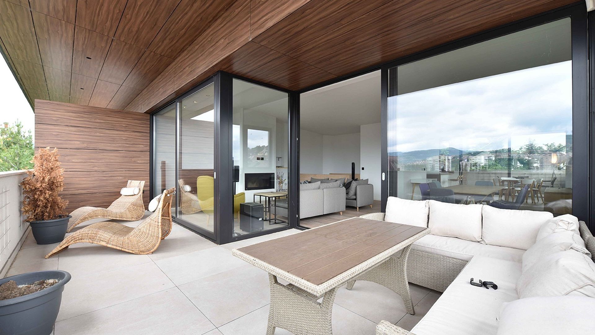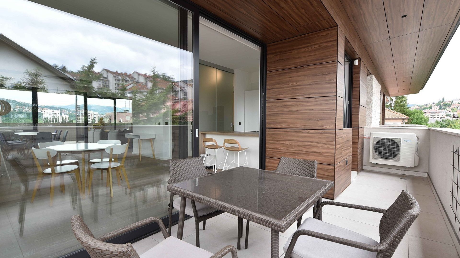 Iznajmljuje se luksuzan i moderan dvoetažni stan u privatnoj zgradi na Grbavici ukupne površine 210 m2. Stan se sastoji od prostranog dnevnog boravka sa kuhinjom i trpezarijom koji ima izlaz na dvije terase, 3 spavaće sobe, 3 kupatila, garderobera, saune i još jedne terase na donjoj etaži.